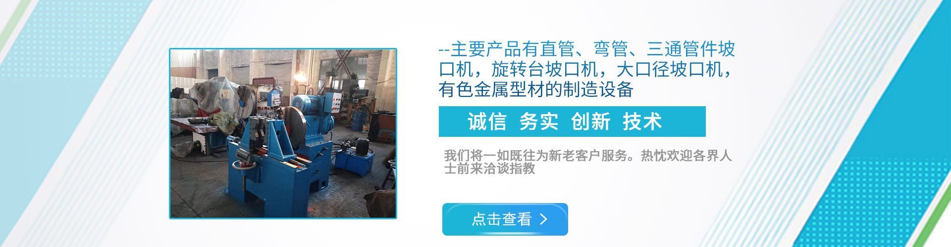 公司現下轄兩個分廠,一分廠主營電動管道坡口機和焊接設備,適用于造船、電力工程安裝、石油、化工、鍋爐廠、冶金以及鋼鐵行業;